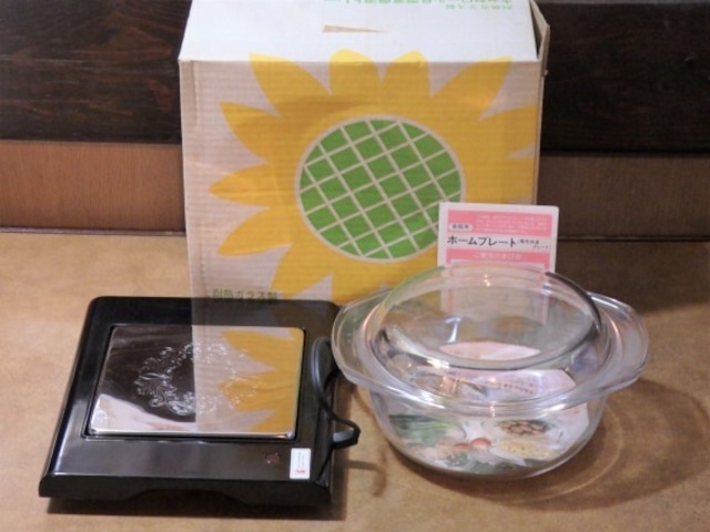 最大径24cm、容量1.5lの耐熱ガラス容器と小さな電気保温トレーのセット レトロポップなひまわりの柄の化粧箱や保温トレーの上にあしらわれたモダンなロココ風柄がとてもおしゃれ、使用感ほぼなしの美品です。 食卓・キッチンが華やいでお料理がますます楽しくなりそうな一品、煮物・スープにご活用ください。
